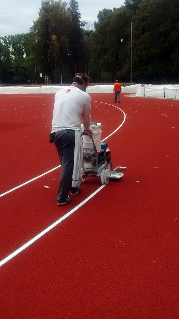 Pista profesional de atletismo: San Rafael se está transformando en el polo deportivo más importante del sur mendocino. En el poli 1 y bajo la atenta supervisión de la Federación Internacional de Atletismo, se pintan los carriles de la nueva pista profesional, que será sede de competencias nacionales e internacionales. El predio tendrá sectores exclusivos para salto en alto, largo, garrocha, lanzamiento de jabalina, bala, disco y martillo.