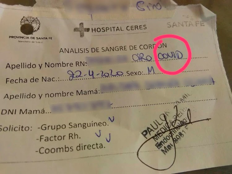 Ciro nació por cesárea y pesó 3,200 kilogramos. Alicia, la abuela paterna del bebé, contó al sitio Diario Ceres que los padres del bebé, Débora y Eduardo, eligieron llamarlo Covid por la particular situación que atraviesa no solo el país sino el mundo entero.