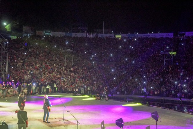 Los conciertos de Abel Pintos transitan diversos géneros y climas, apoyados en su calidad vocal y su carisma. El cariño con su público es mutuo, de cercanía, que lo llevó a recorrer de extremo a extremo el escenario del teatro griego para sellar ese compromiso.