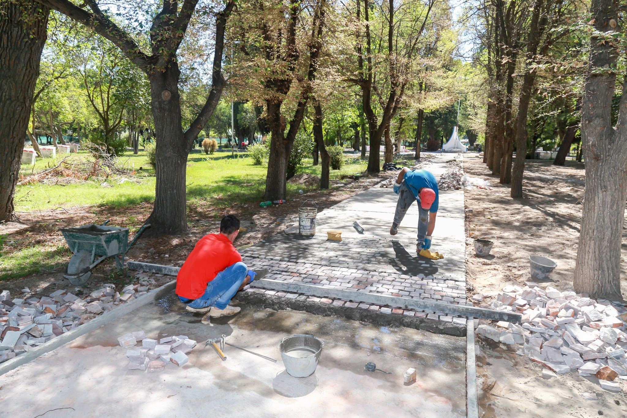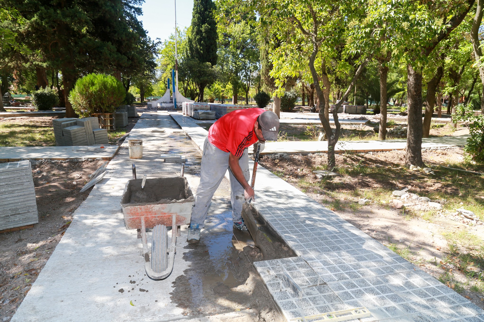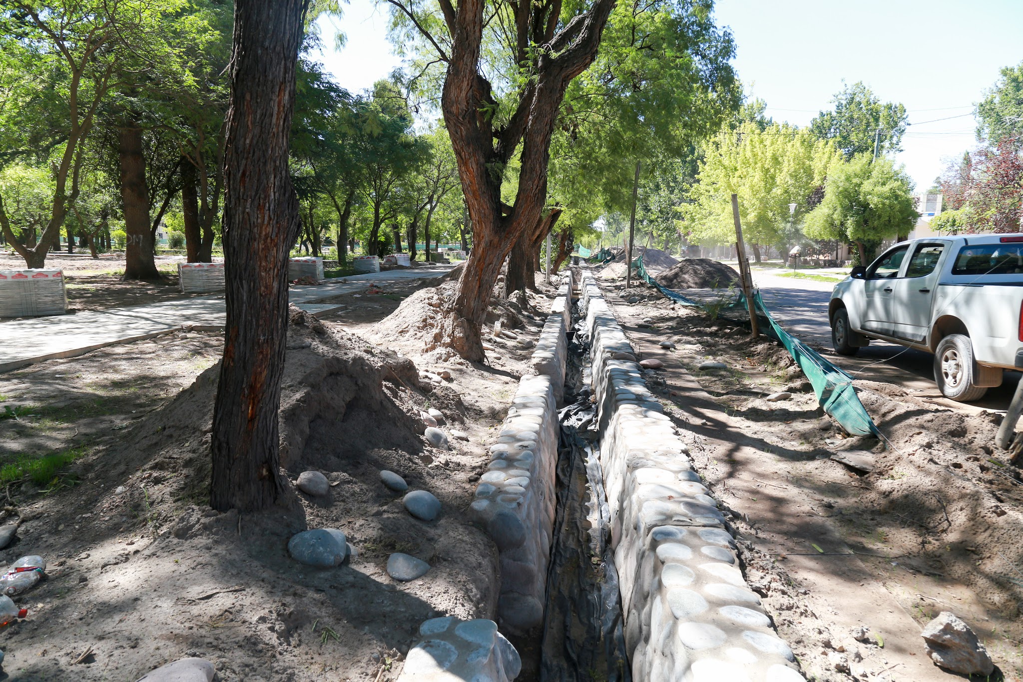 Actualmente se trabaja en el empedrado de las acequias que rodean la plaza, que fueron revestidas previamente con cemento.