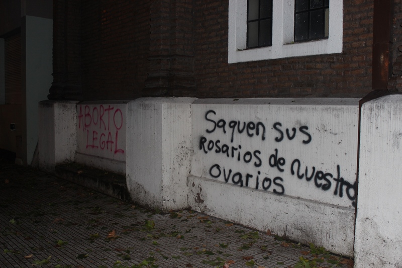 Más allá del genuino reclamo, algunos manifestantes (hombres y mujeres) con sus rostros cubiertos, rayaron las paredes laterales de la Catedral, generando repudio incluso en otros de los que allí estaban.
