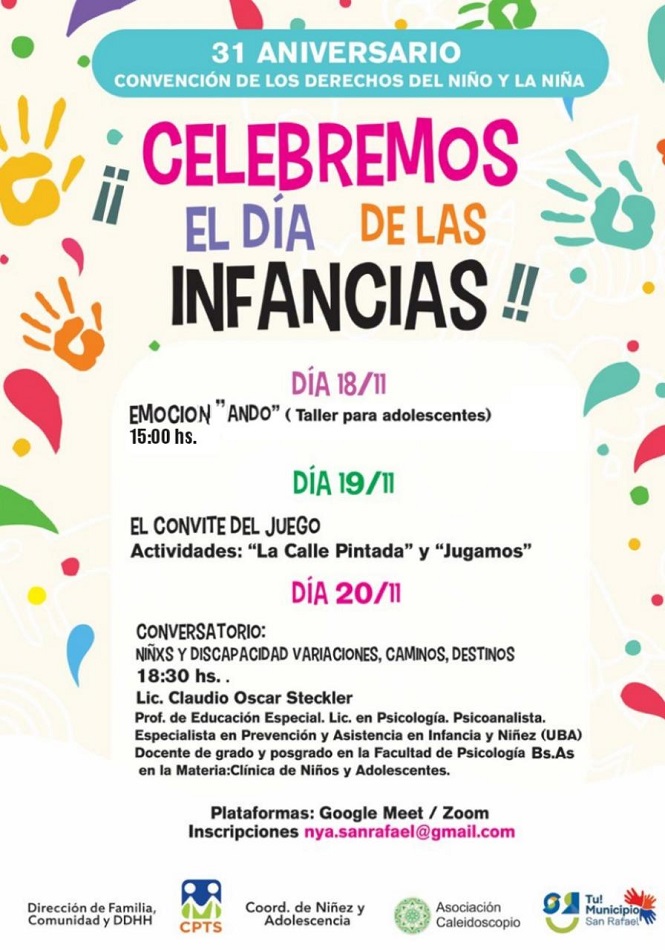 Finalmente, el viernes 20 se realizará un conversatorio sobre “niños y discapacidad” a cargo del Licenciado Claudio Steckler, profesor de la cátedra de psicología de grado y posgrado de la Universidad de Buenos Aires.