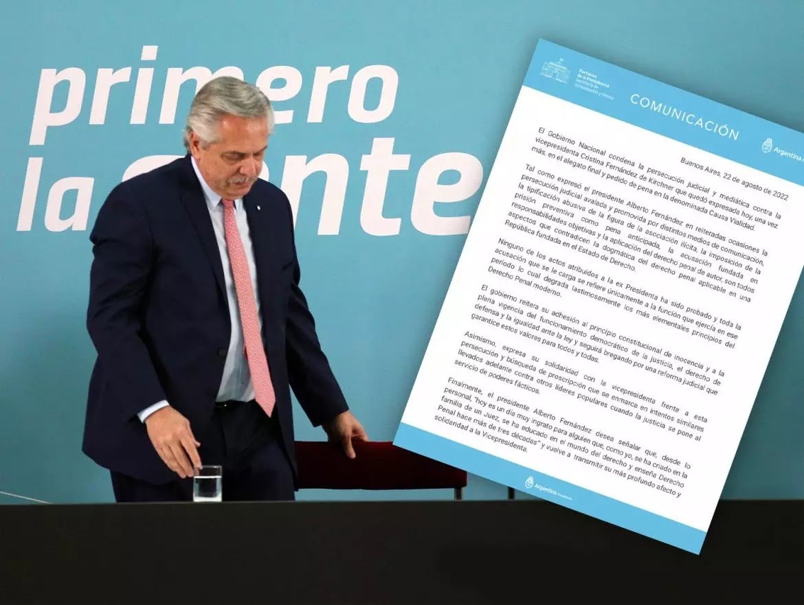 El mensaje del primer mandatario fue acompañado de una carta de apoyo, que -en su párrafo saliente- expresa: “El Gobierno Nacional condena la persecución judicial y mediática contra la vicepresidenta Cristina Fernández de Kirchner que quedó expresada hoy, una vez más, en el alegato final y pedido de pena en la denominada Causa Vialidad”.