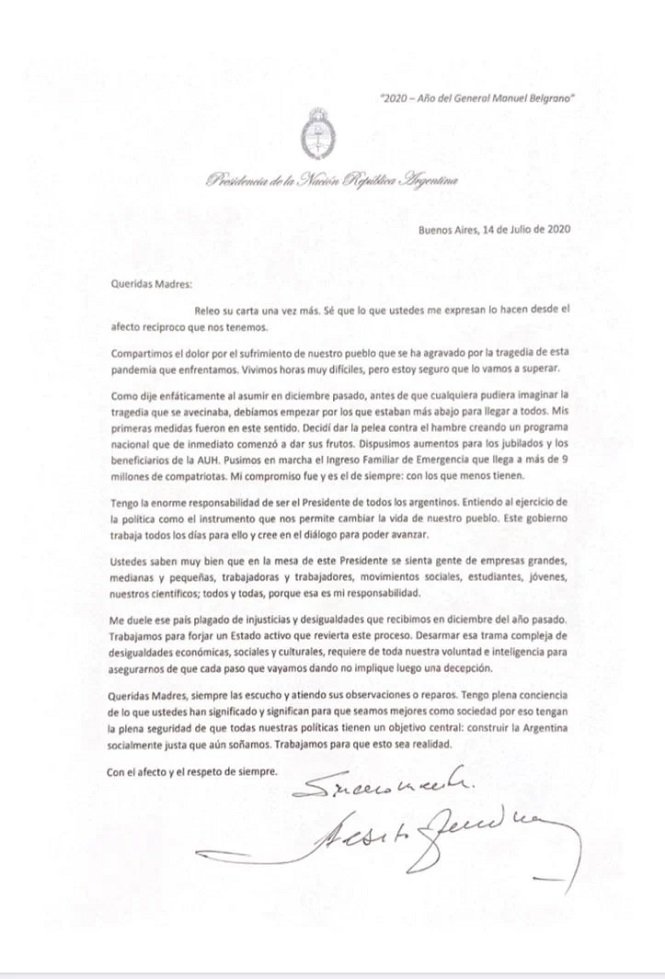 El Presidente difundió a través de las redes sociales su respuesta a una carta que hoy le dirigieron Madres de Plaza de Mayo, en la que expresaron su “dolor” por las reuniones que Fernández mantuvo en los últimos días con quienes “explotan” a los trabajadores y fueron responsables del “secuestro” de sus hijos durante la última dictadura.