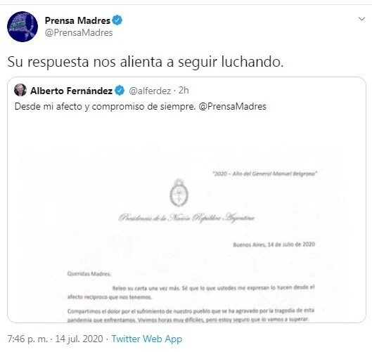 Después de la explicación del Presidente, Madres publicó en Twitter una sintética frase para dar por terminado el intercambio: “Su respuesta nos alienta a seguir luchando“.