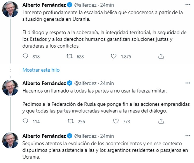 “Lamento profundamente la escalada bélica que conocemos a partir de la situación generada en Ucrania. El diálogo y respeto a la soberanía, la integridad territorial, la seguridad de los Estados y a los derechos humanos garantizan soluciones justas y duraderas a los conflictos”, escribió Alberto Fernández en Twitter.