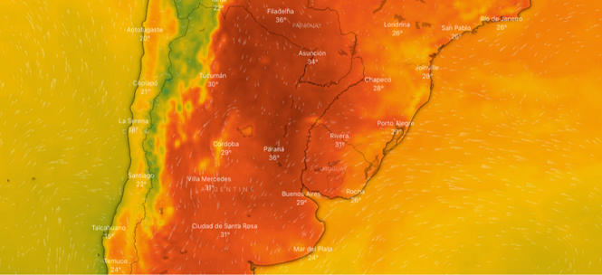 El SMN prevé para esta tarde máximas de 40 grados para la capital de Santiago del Estero; 39 en Resistencia, en Chaco; 38 en la localidad formoseña de Las Lomitas; 37 en San Miguel de Tucumán; y 37 en Paraná, en Entre Ríos.