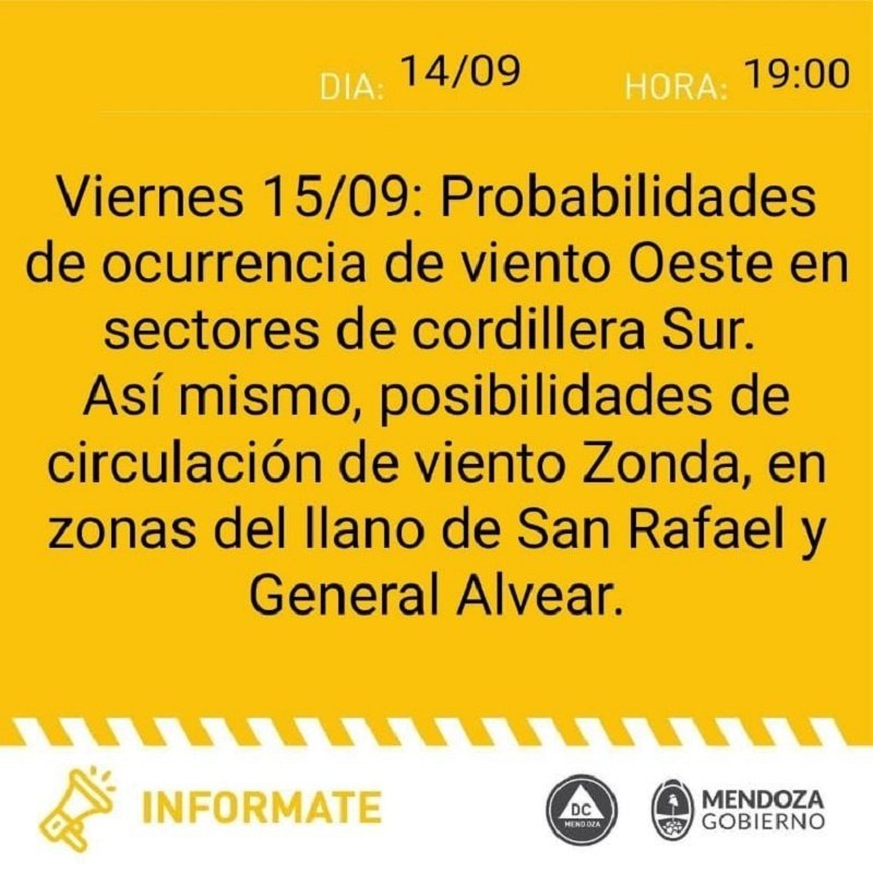 El sistema nacional ha emitido una alerta meteorológica de nivel amarillo debido al viento Zonda, que podría resultar en daños o interrupciones de actividades en la provincia.