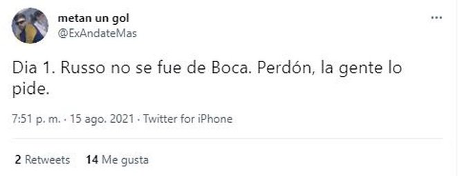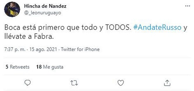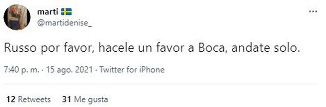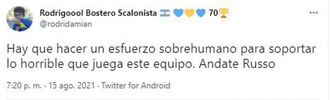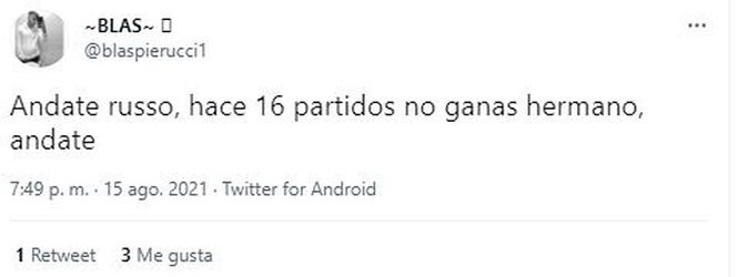 Ni bien finalizó el encuentro, las redes sociales reflejaron el malhumor de los simpatizantes del conjunto de la Ribera que, al igual que ya había ocurrido en otras oportunidades, pidieron masivamente por la salida del entrenador, hasta transformar a “andate Russo” en tendencia.
