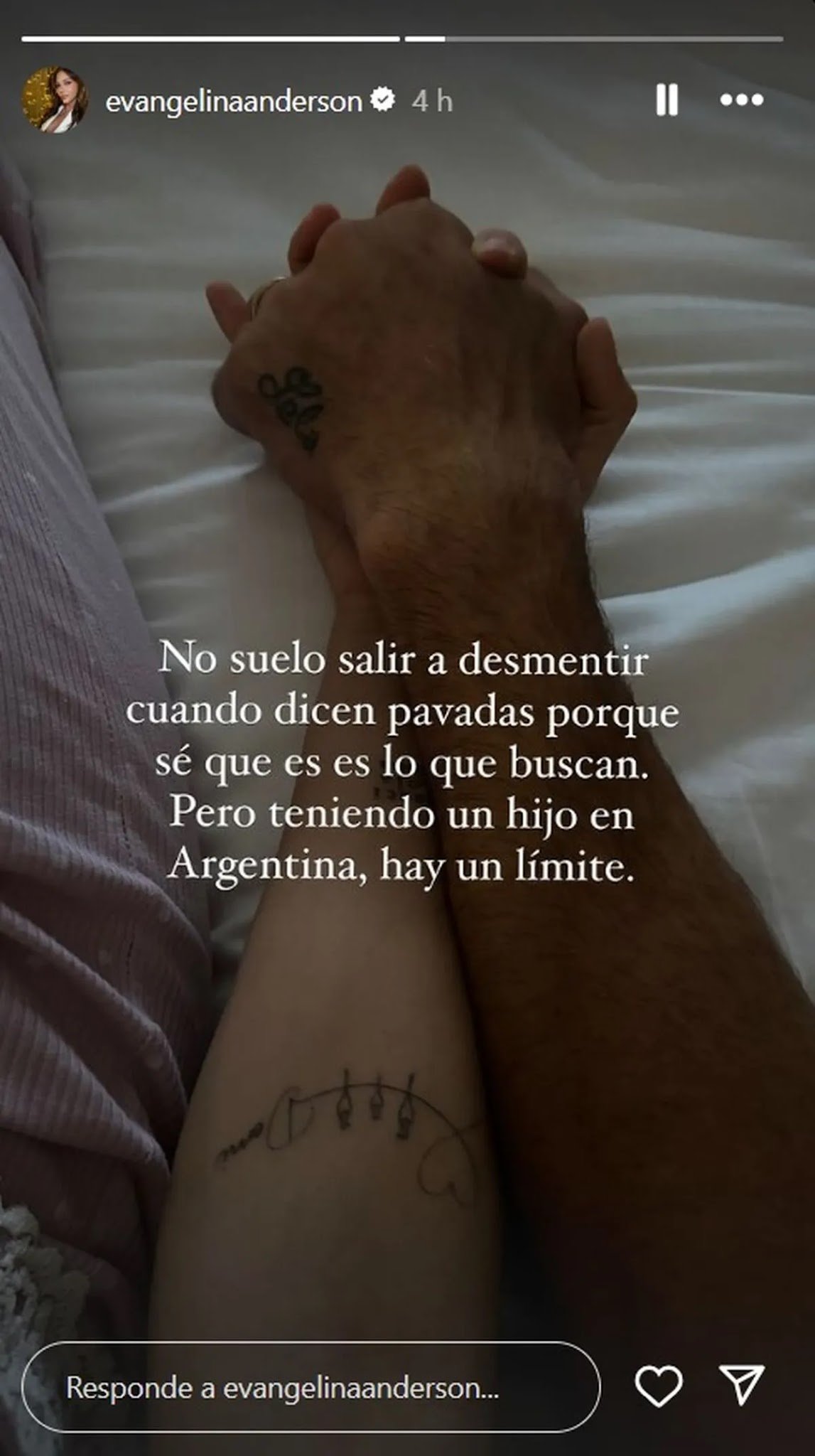 La modelo desmintió a la angelita con un posteo contundente en su Instagram. “No suelo salir a desmentir cuando dicen pavadas porque sé que es lo que buscan. Pero, teniendo un hijo en la Argentina, hay un límite”, expresó y subió una foto de su mano entrelazada a la de su pareja.