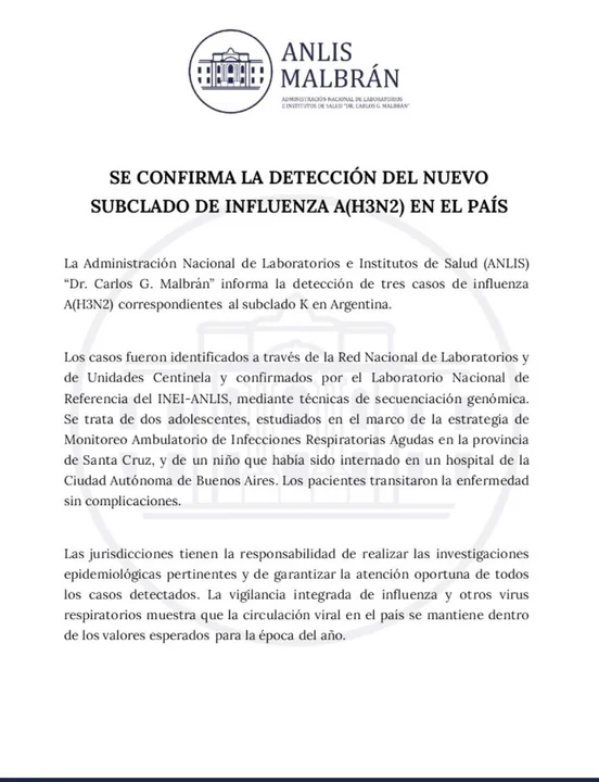 La Administración Nacional de Laboratorios e Institutos de Salud (ANLIS) “Dr. Carlos G. Malbrán” confirmó la detección de tres casos de influenza A (H3N2) correspondientes al subclado K en el país, identificados mediante técnicas de secuenciación genómica, según informó la Agencia Noticias Argentinas.