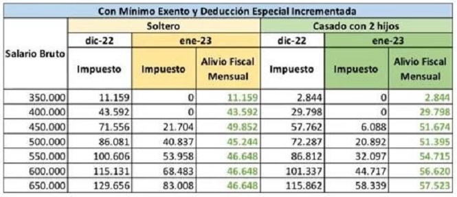 Un empleado casado, con dos hijos, con un salario bruto de $500.000, que hoy paga $72.287 por mes, pasará a pagar $20.892, lo que representa un alivio fiscal de $51.395 mensuales.