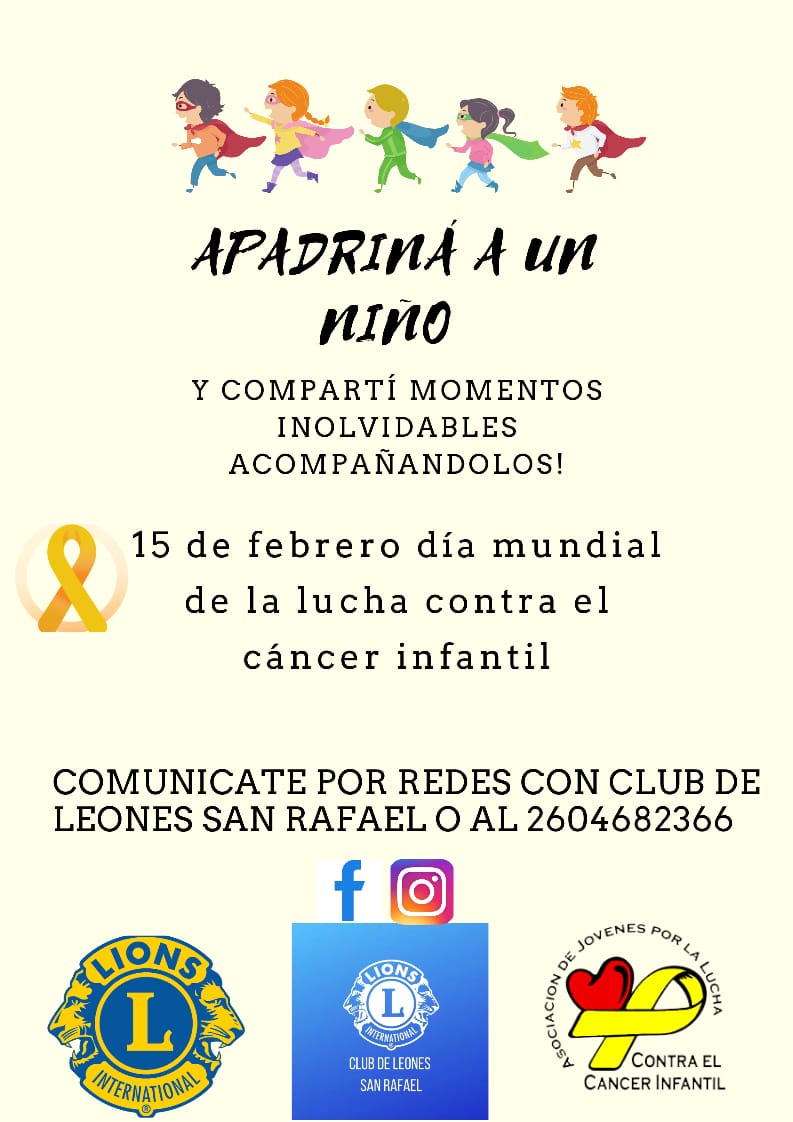 El 15 de febrero se desarrollará el Día Mundial de la Lucha Contra el Cáncer Infantil. En virtud de ello, el Club de Leones San Rafael invita a sumarse como padrinos de niños que se encuentran atravesando la enfermedad y que están siendo contenidos en La Casita de Malén.