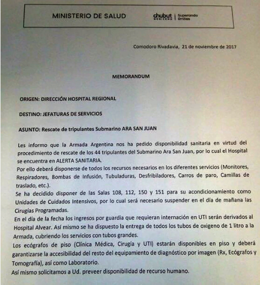 Además, la Armada pidió esta noche que el Hospital Regional de Comodoro Rivadavia, tanto como el Hospital Alvear ubicado sobre la costa, unos 5 kms al norte del puerto de esa ciudad patagónica, permanezcan en alerta máximo y con disponibilidad de camas, equipamiento de terapia intensiva y recursos humanos para la eventualidad de un rescate.
