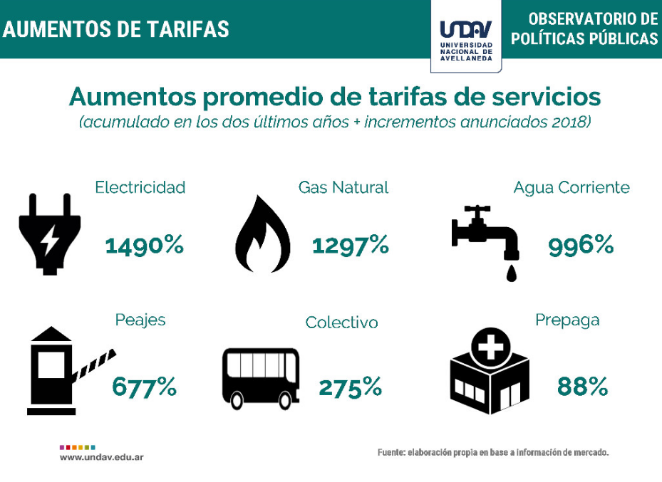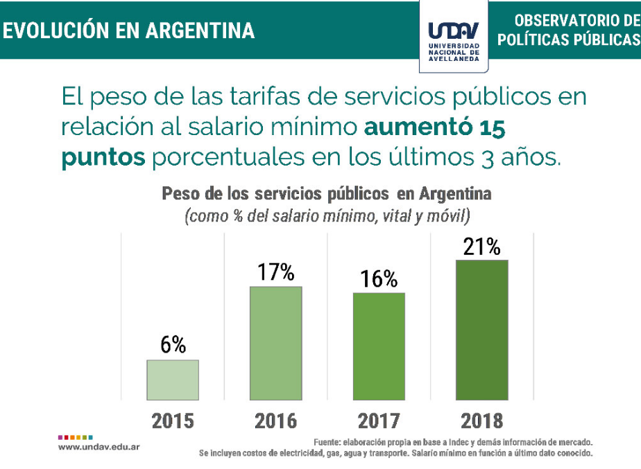 Según un informe del Observatorio de Políticas Públicas de la UNDAV, desde 2015 se pasó de una incidencia muy baja del costo tarifario sobre el salario, cercana al 6% pero a partir del cambio de Gobierno esa incidencia sustantivamente mayor del 21%.
