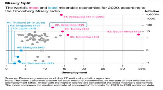 Fue elaborado por Bloomberg y mide las tasas de inflación y desempleo entre 60 países. Solo Venezuela está peor.La prestigiosa agencia Bloomberg publicó un ranking de las peores economías globales denominado Misery Index 2020 y Argentina fue clasificada en el segundo lugar por detrás de Venezuela.