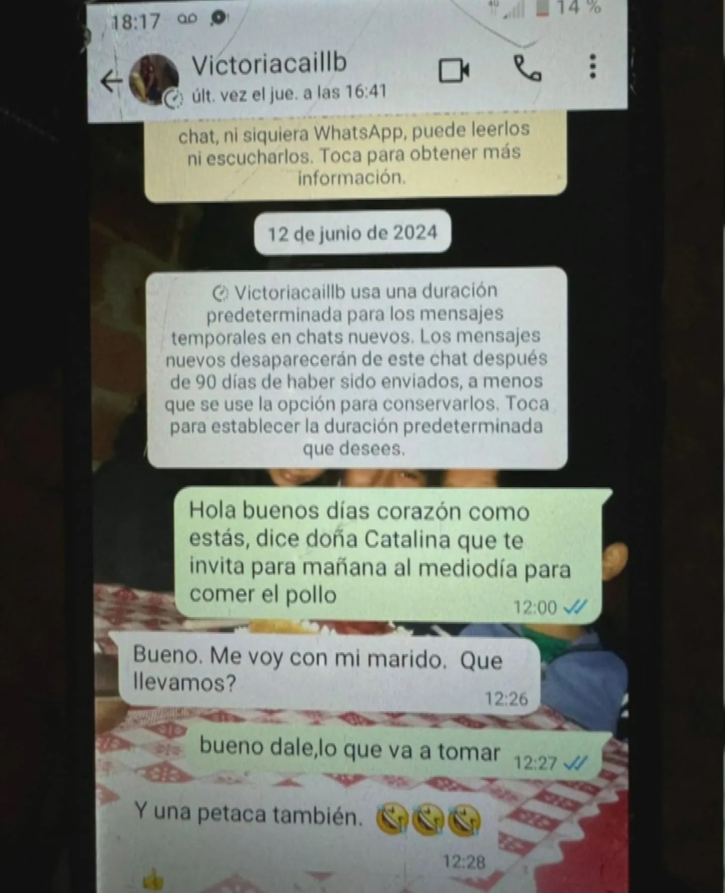 “Dice doña Catalina que te invita para mañana al mediodía para comer el pollo”, le escribió Laudelina a Victoria Caillava, quien aceptó y dijo: “Me llevo a mi marido”. Luego, la funcionaria imputada preguntó qué debía llevar, a lo que la tía del nene respondió: “Lo que va a tomar”.