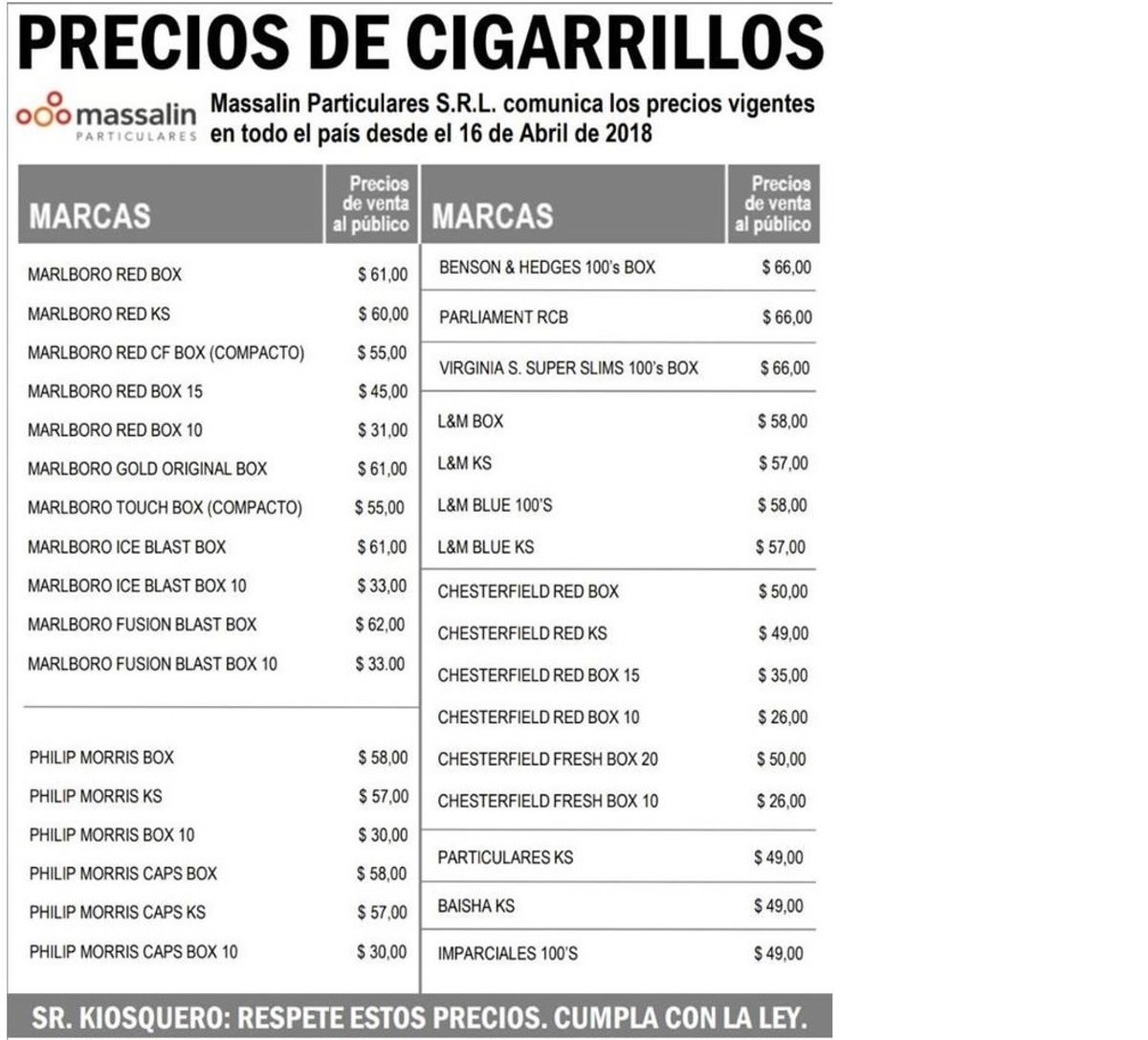Según la comunicación, el paquete de Marlboro Red Box costará $ 61; el KS, $ 60; el Red Box de 15 , $ 45 y el de 10, $ 31. En tanto, el Philips Morris Box de 20 pasará a costar $ 58; el KS, $ 57; y el de 10 unidades, $ 30.