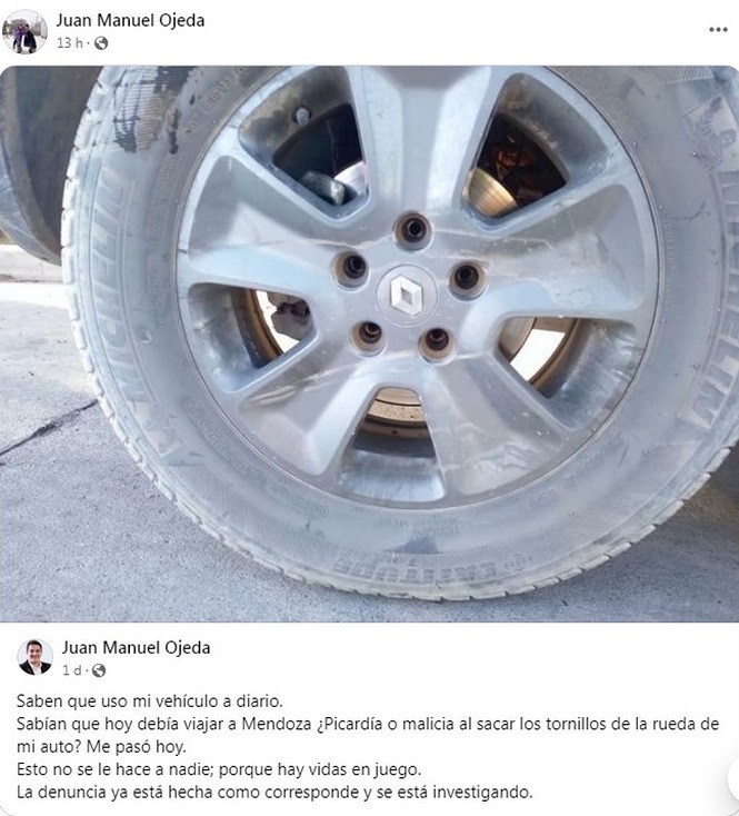 “Sabían que hoy debía viajar a Mendoza ¿Picardía o malicia al sacar los tornillos de la rueda de mi auto? Me pasó hoy”, denunció públicamente al tiempo que acompañó la foto de la rueda sin los cinco tornillos.