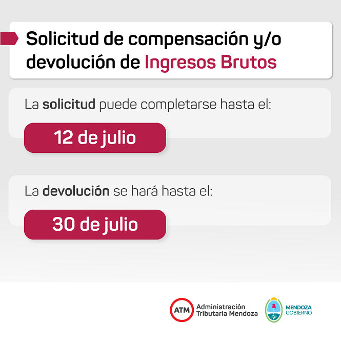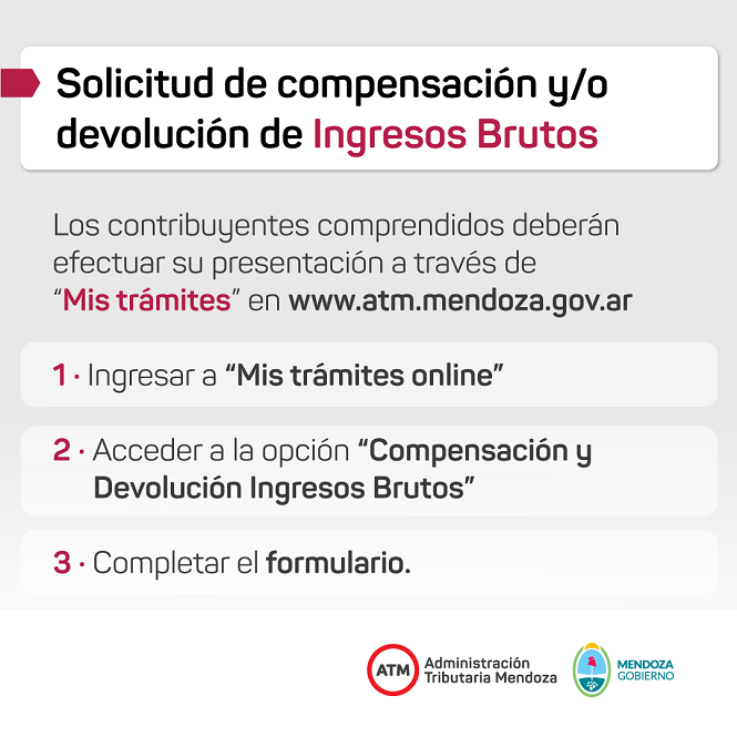 Los contribuyentes comprendidos deberán efectuar su presentación a través de “Mis trámites” de la página web www.atm.mendoza.gov.ar. Posteriormente deberán ingresar a “Mis trámites online” y acceder a la opción “Compensación y Devolución Ingresos Brutos” y finalmente completar el formulario.