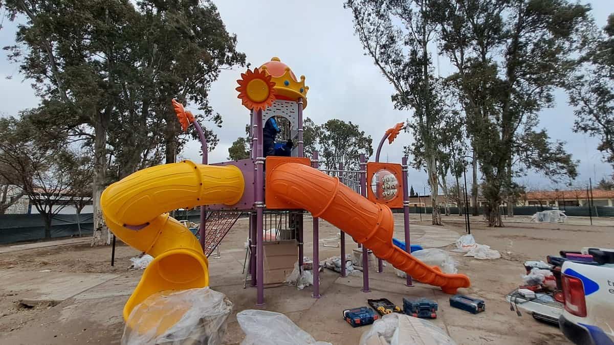 Frente a la recientemente renovada plaza Balbino Arizu de Villa Atuel entró en su recta final la obra del Parque Infantil para el distrito.