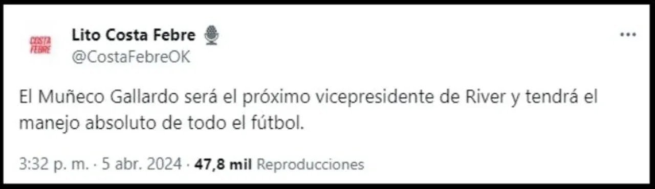 “El Muñeco Gallardo será el próximo vicepresidente de River y tendrá el manejo absoluto de todo el fútbol”, escribió sembrando la incertidumbre en los usuarios, quienes no tardaron en viralizar su posteo.