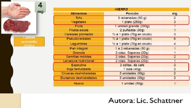 - Hay que prestar atención a la elección de fuentes alimentarias ricas en hierro de origen vegetal, además se sugiere ingerir una fruta cítrica o jugo con las comidas. El fin de esto último es potenciar la absorción del hierro de alimentos de origen vegetal. Hay que evitar una hora antes y una hora después de las comidas ingerir mate, té o café, contienen anti nutrientes que impiden la mejora absorción del hierro de origen vegetal.