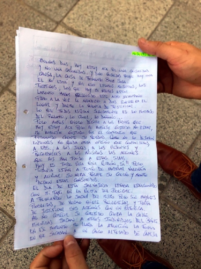 Un taxista que declaró este jueves como testigo en el juicio por el crimen de Fernando Báez Sosa escribió un texto dirigido a los ocho rugbiers acusados del ataque, y que intentó sin éxito leer ante el tribunal, en el que les dice que “todavía están a tiempo de mostrar valentía”.