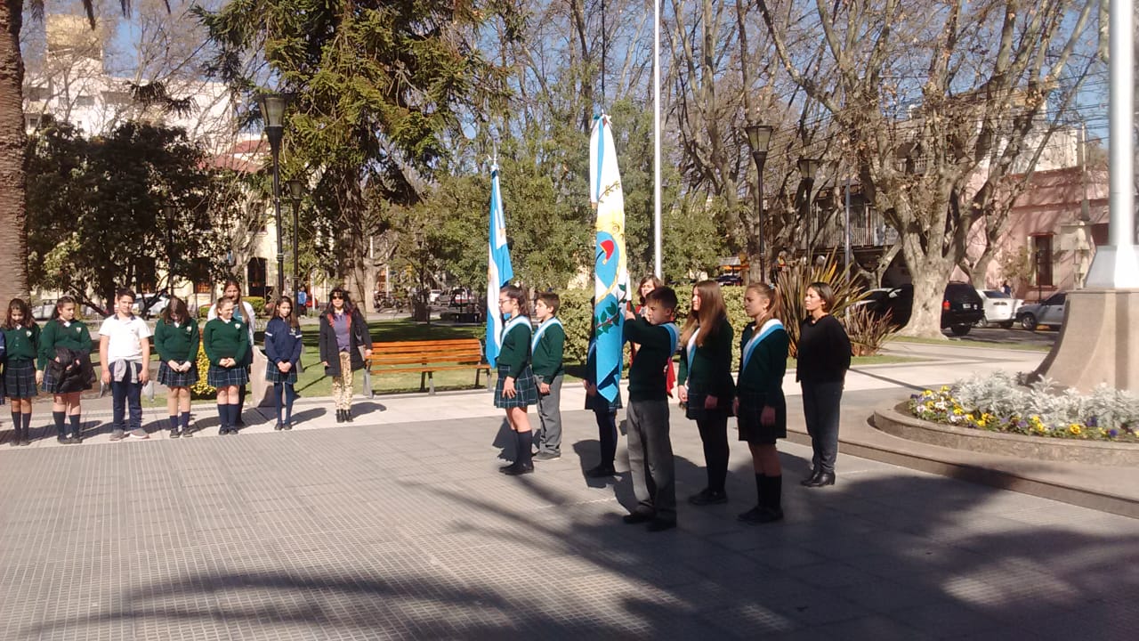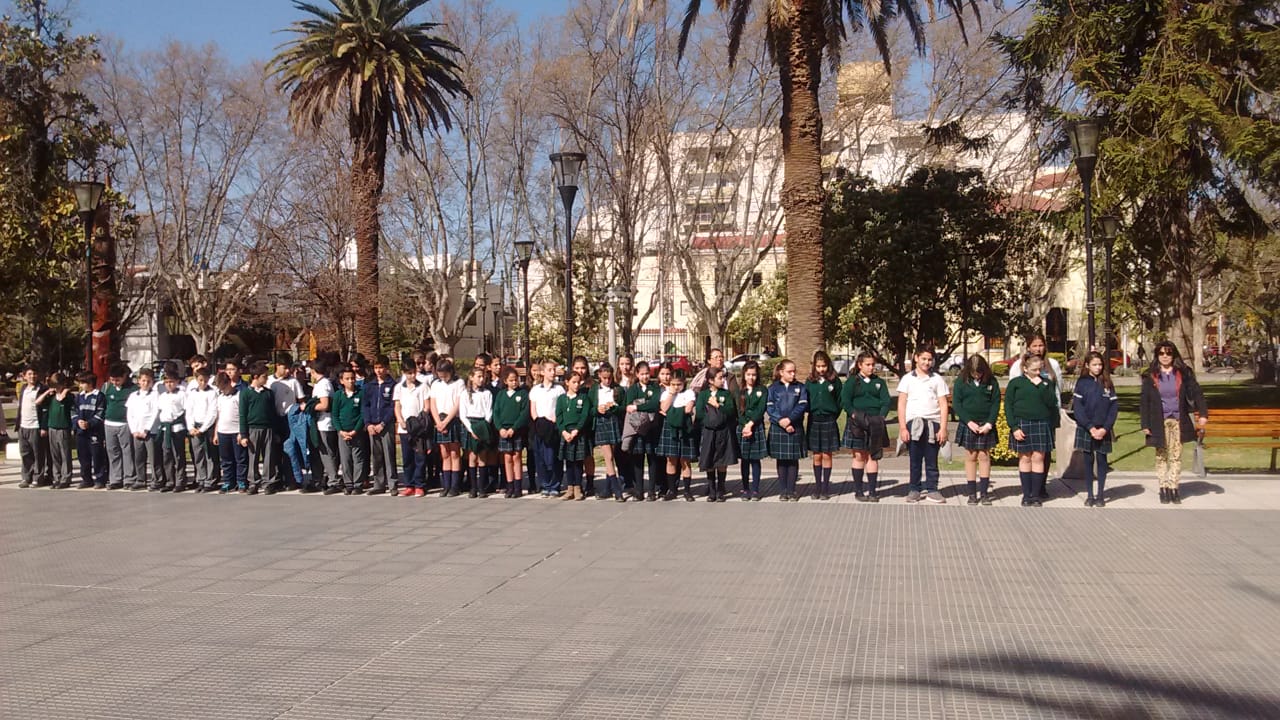 Este viernes se llevó a cabo un acto en la plaza San Martín, en el que alumnos de nivel primario del colegio Del Carmen honraron la memoria del Padre de la Patria, colocándole una ofrenda floral. Además, por supuesto, estuvo presente una imagen de la Virgen del Carmen.