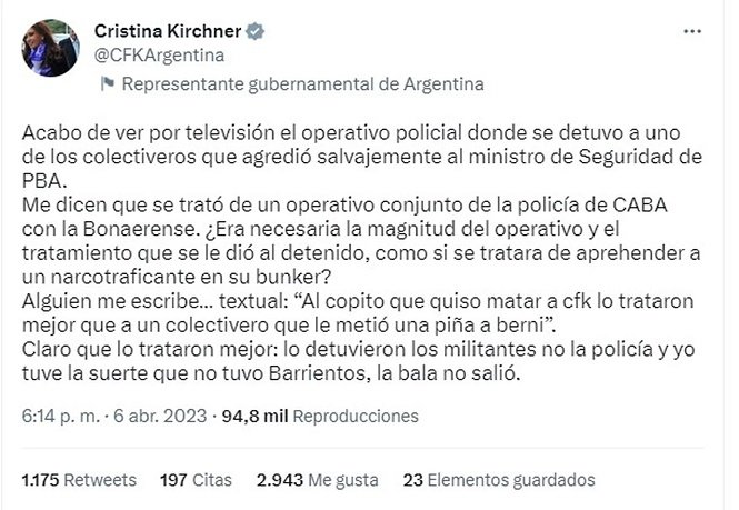 La vicepresidenta Cristina Kirchner rompió el silencio para cuestionar la detención de los colectiveros que atacaron al ministro de Seguridad bonaerense, Sergio Berni. “Me dicen que se trató de un operativo conjunto de la policía de CABA con la Bonaerense. ¿Era necesaria la magnitud del operativo y el tratamiento que se le dio al detenido, como si se tratara de aprehender a un narcotraficante en su bunker?”, escribió en su cuenta de Twitter.