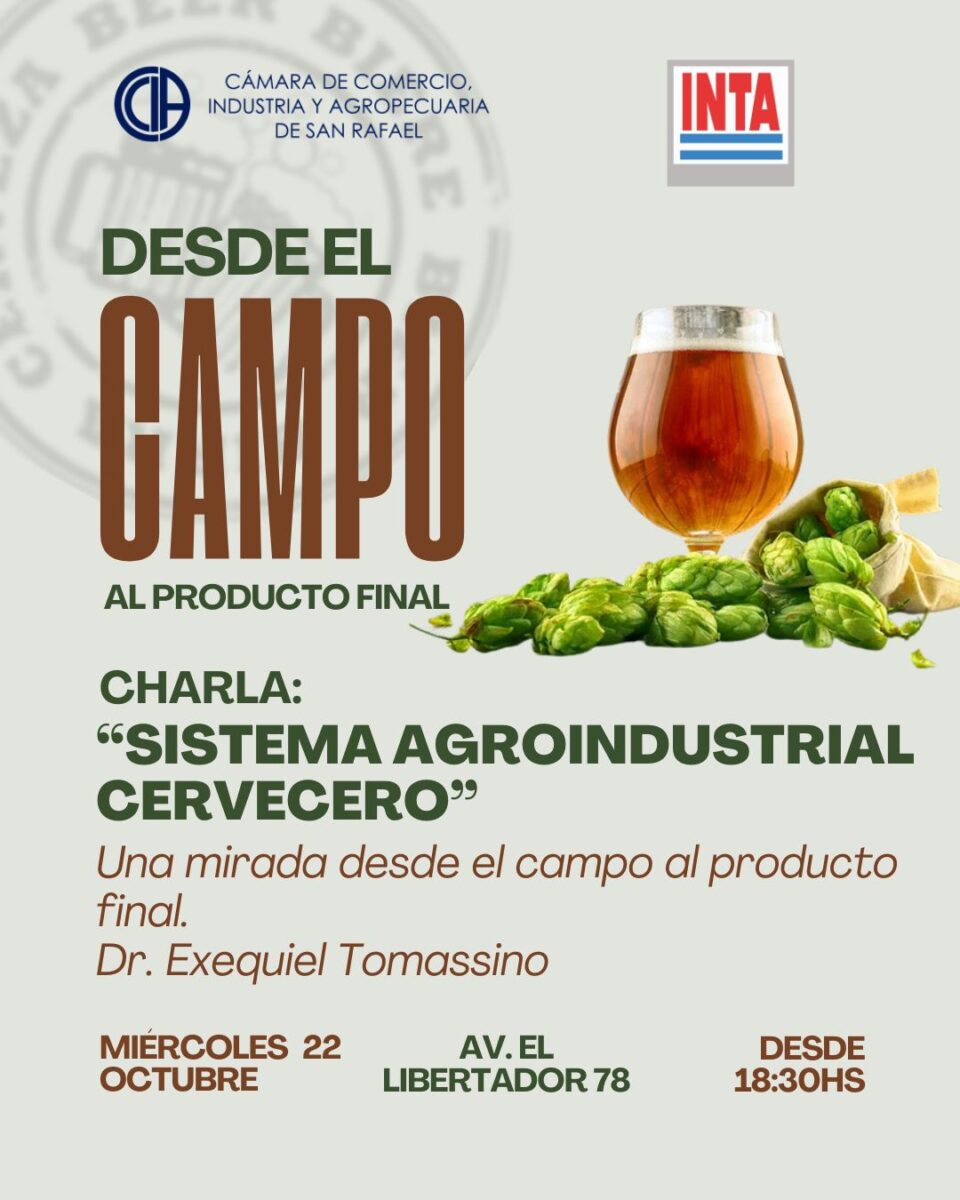 El próximo miércoles 22 de octubre, a las 18.30, se desarrollará en el edificio de la Cámara de Comercio, Industria y Agropecuaria de San Rafael (CCIA) —ubicado en Avenida El Libertador 78— una charla técnica titulada “Sistema agroindustrial cervecero: una mirada desde el campo al producto final”.