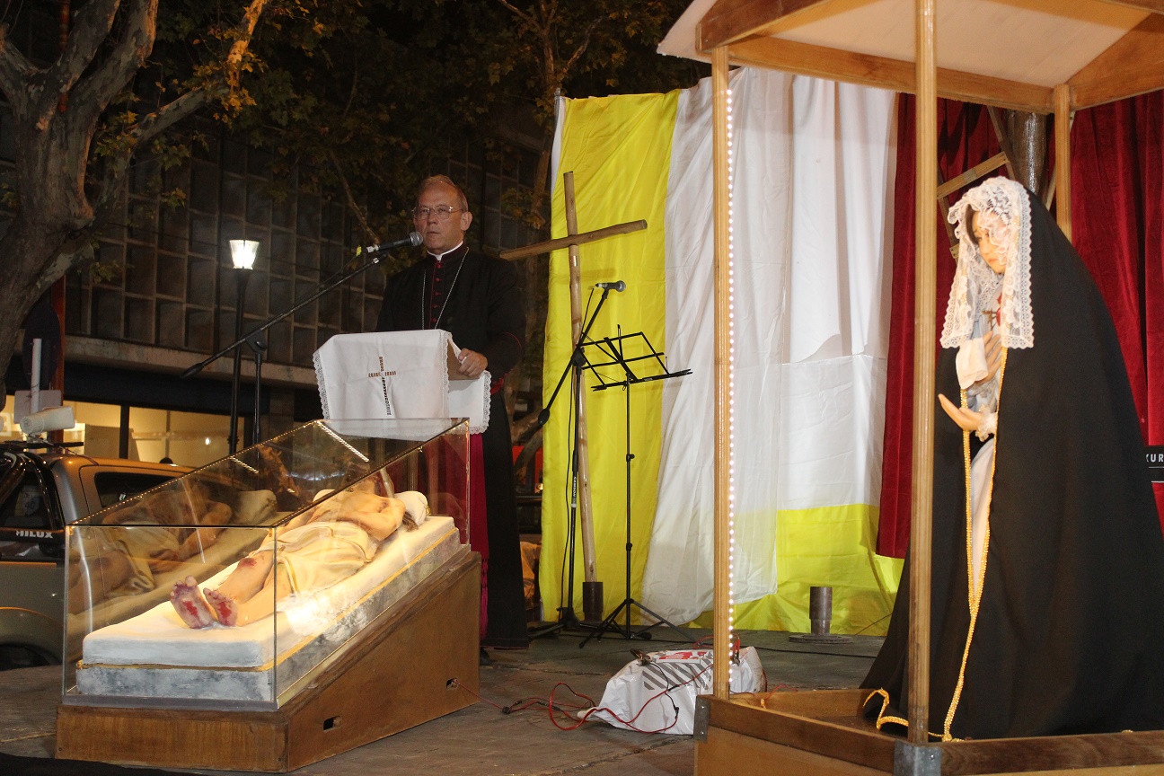 “Hemos acompañado a Jesús en su Vía Crucis tratando de entrar en comunión con sus sentimientos, con sus actitudes interiores más profundas, y hemos acompañado a la Virgen, a su madre, a nuestra madre a lo largo de las 14 Estaciones y hemos querido entrar en la intimidad de este misterio que nos sobrecoge, que nos desborda y contemplando al Cristo yacente y a María dolorosa podemos entrar también en el corazón de la Virgen”, expresó el obispo y se preguntó poco después: “¿Qué dolor hay más grande para una madre que ver morir a su hijo?, ¿qué dolor es más lacerante, más terrible que ver al fruto de sus entrañas agonizar o morir?” “Nosotros queremos acompañar en su dolor a María”, remarcó.