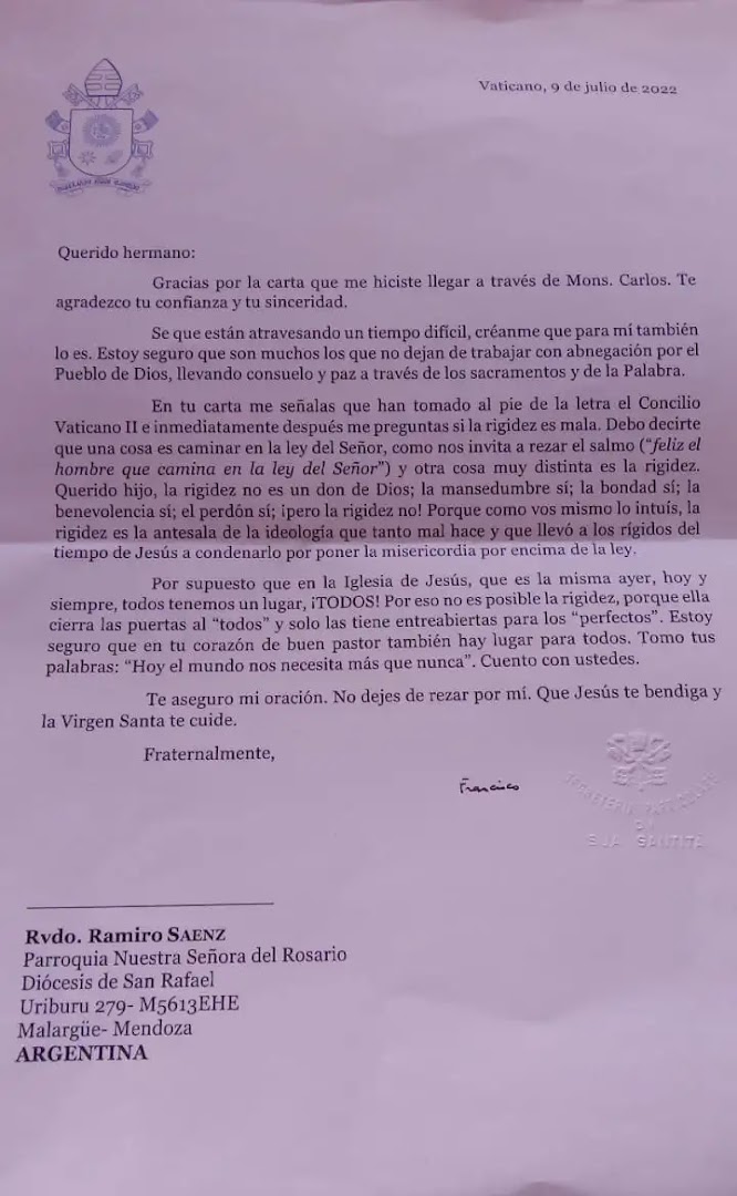 El Santo Padre respondió a una carta que le envió el 17 de abril de 2022 el P. Ramiro Sáenz, de la parroquia Nuestra Señora del Rosario de la Diócesis de San Rafael, a la que ACI Prensa tuvo acceso.