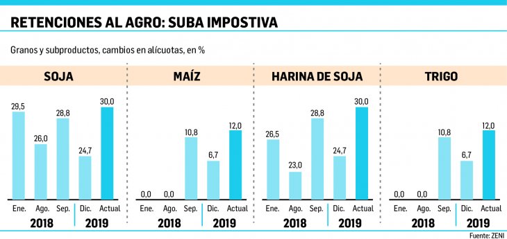Con el nuevo esquema, para el caso de la soja, representaría un aumento en la alícuota del 5,3% con respecto al régimen que estuvo vigente hasta el viernes: queda en 30%. En el caso del maíz, el trigo y el girasol, el incremento es el mismo y el derecho a exportación quedó en 12%.