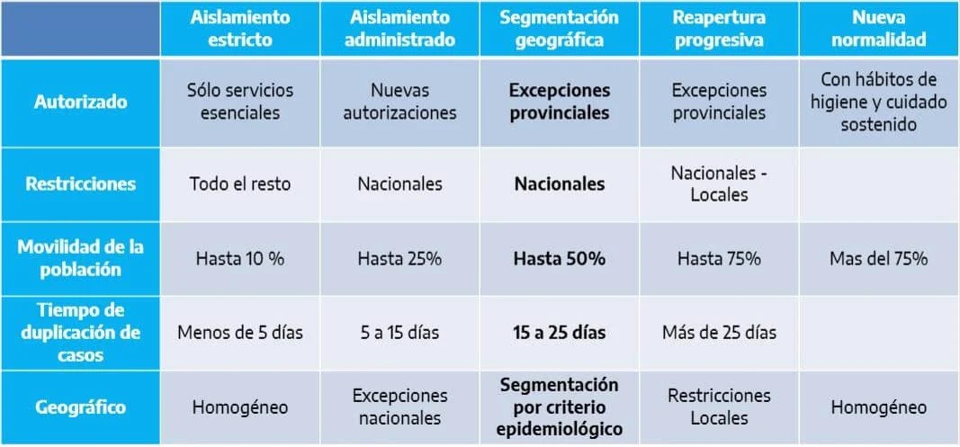Después de la fase “segmentada” que terminará el próximo 10 de mayo empezará la de “reapertura progresiva”. Las actividades habilitadas seguirán dependiendo de las provincias, mientras que las restricciones se definirán a nivel nacional y local. La movilidad aumentará hasta el 75% y el tiempo de duplicación de los contagios superará los 25 días. La cuarentena tendrá un criterio más localizado.