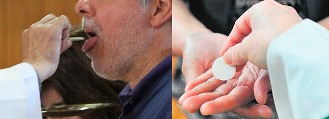 Alguno dirá que nada obsta a que mientras se comulga en la boca se use las manos de bandeja. Surgen tres problemas: