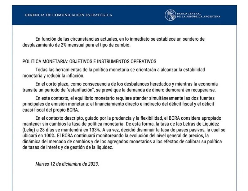 El Banco Central de la República Argentina (BCRA) comunicó que se mantendrá la tasa de política monetaria luego de que el ministro de Economía, Luis “Toto” Caputo, anunciara el plan de ajuste para evitar la hiperinflación.