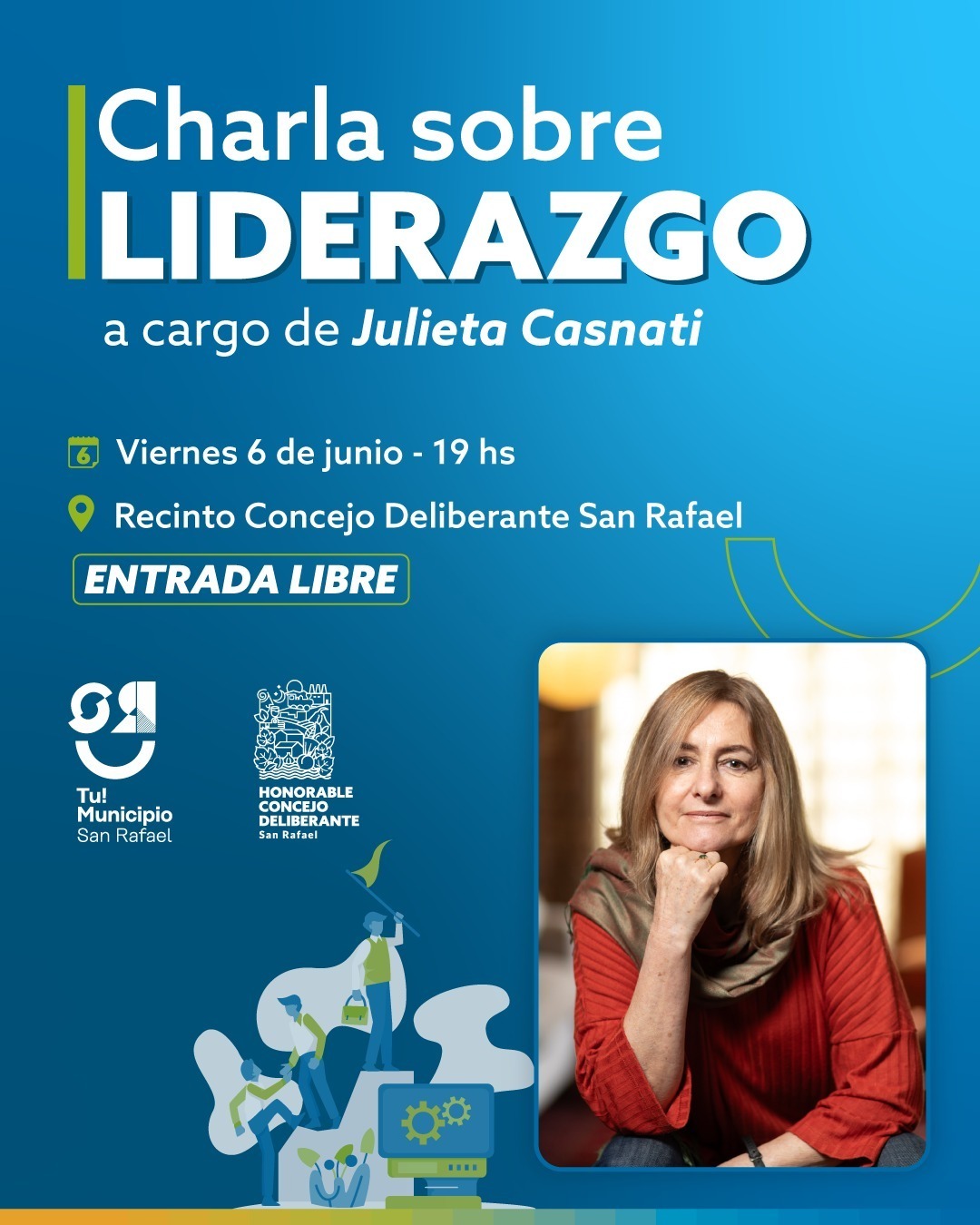Este próximo viernes 6 de junio, en el marco del Día del Periodista (se celebra al día siguiente), el recinto del Concejo Deliberante será escenario de una importante charla sobre liderazgo, a cargo de Julieta Casnati, quien además de ser nieta del ex intendente sanrafaelino, Egidio Casnati, es una reconocida líder en coaching y desarrollo de liderazgo en Argentina y diferentes puntos de América Latina.
