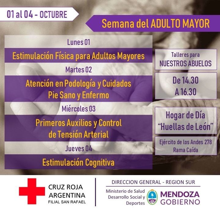 Organizadas por la Cruz Roja Argentina Filial San Rafael y el Ministerio de Salud Región Sur, se desarrollaron actividades en la Semana del Adulto Mayor en el Hogar de Día “Huellas de León” ubicado en calle Ejército de los Andes de Rama Caída.