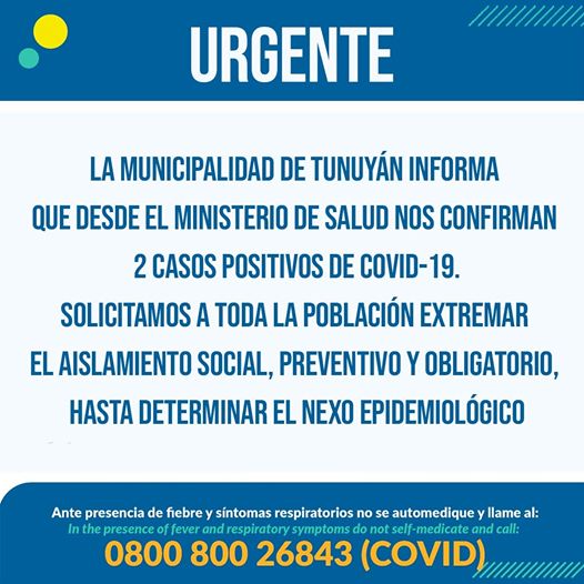 Según aseguró la Municipalidad, los dos casos fueron confirmados esta tarde por el Ministerio de Salud de Mendoza. Por lo tanto, se solicitó a la población que extreme el aislamiento social, preventivo y obligatorio.