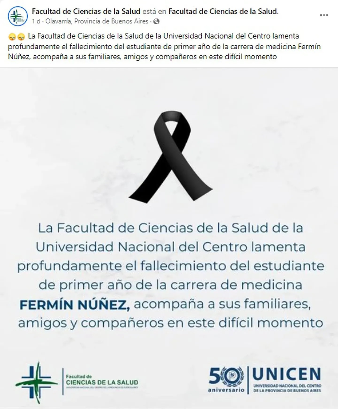 Tras conocerse la noticia de su fallecimiento, la Universidad hizo un emotivo comunicado en sus redes sociales. “La Facultad de Ciencias de la Salud de la Universidad Nacional del Centro lamenta profundamente el fallecimiento del estudiante de primer año de la carrera de medicina Fermín Núñez, acompaña a sus familiares, amigos y compañeros en este difícil momento”.
