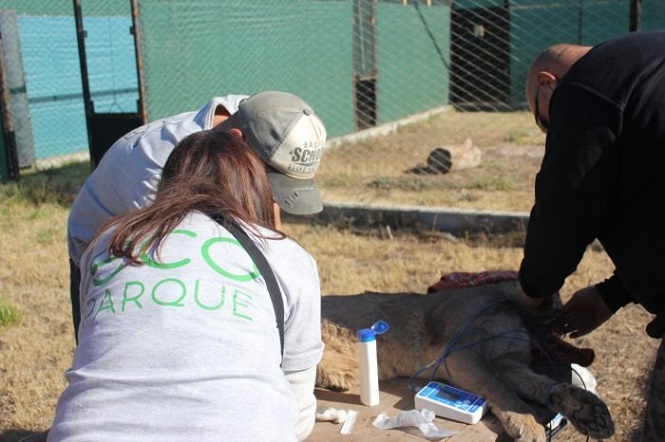 El pasado jueves, en un trabajo en conjunto entre voluntarios de la Fundación, la Secretaria de Ambiente y Ordenamiento Territorial, la Dirección de Recursos Naturales y el Ecoparque de Mendoza, se llevó a cabo la toma de muestras para estudios sanitarios y el traslado de los pumas a los nuevos recintos construidos en el predio del “Centro”, los cuales cuentan con una superficie total de ochocientos metros cuadrados, para una mejor rehabilitación y comodidad de los animales.