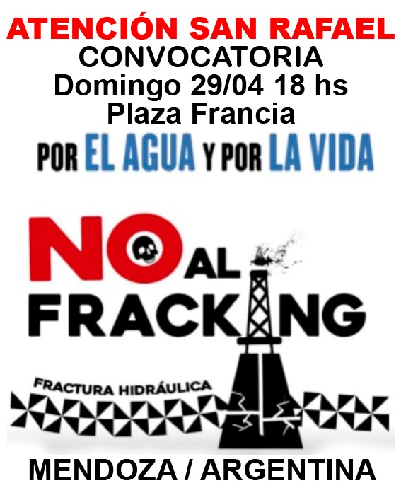 A través de redes sociales (especialmente WhatsApp), circula una imagen -sin remitente- invitando a una manifestación el domingo 29 de abril contra el fracking en Mendoza. La convocatoria es en plaza Francia a las 18 “por el agua y por la vida”.