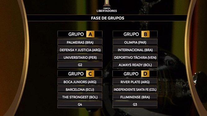 Las seis fechas de los grupos se jugarán la semana del 21-4, 28-4, 5-5, 12-5, 19-5 y 26-5. Para conformar los bolilleros del sorteo se tuvo en cuenta el ranking de clubes de la Conmebol al 21 de febrero pasado.