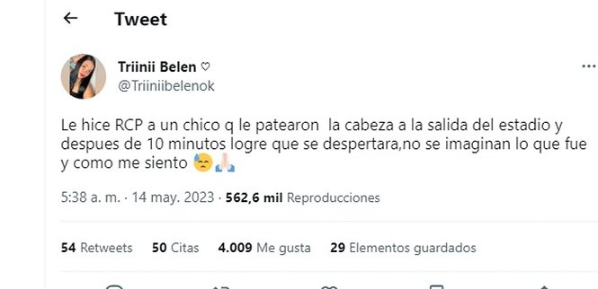 “Le hice RCP a un chico que le patearon la cabeza a la salida del estadio y después de 10 minutos logré que se despertara, no se imaginan lo que fue y cómo me siento”, escribió la joven en su cuenta de Twitter minutos después del hecho.