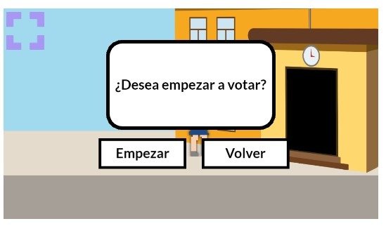 Para poder usar el videojuego, que simula cómo será el día de la elección, lo primero que se debe hacer es click sobre el cuadrado violeta que aparece al costado izquierdo de la pantalla. Allí aparecen tres personajes para elegir el avatar con el que se dará inicio al juego. Manteniendo la flecha apretada hacia la derecha comienza a moverse hasta llegar a la escuela donde deberá emitir el sufragio.