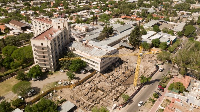 Los trabajos que se ejecutan en el predio se dividen en dos etapas: la primera ya está en marcha y consiste en la construcción del nuevo edificio, que dará lugar a la prestación de más y mejores servicios sanitarios. Divididos en tres plantas, se construyen 6.000 m2, incluido el espacio destinado a un helipuerto y el agregado de una pasarela cubierta que unirá el edifico existente con la nueva construcción.