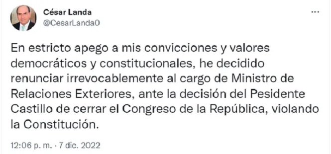 “En estricto apego a mis convicciones y valores democráticos y constitucionales, he decidido renunciar irrevocablemente al cargo de Ministro de Relaciones Exteriores, ante la decisión del Presidente Castillo de cerrar el Congreso de la República, violando la Constitución”, indicó César Landa en su cuenta de Twitter.