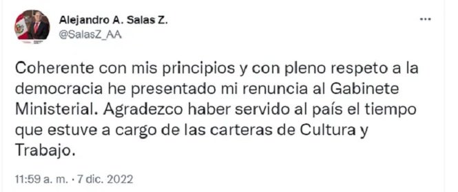 “Coherente con mis principios y con pleno respeto a la democracia, he presentado mi renuncia al Gabinete Ministerial”, indicó Alejandro Salas, ministro de Trabajo.