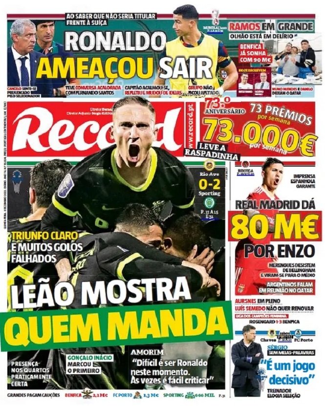 En ese contexto, la portada de Récord tituló “Ronaldo amenazó con irse” al enterarse de que el entrenador Fernando Santos había decidido no incluirlo como titular ante Suiza, en la goleada que los portugueses le propinaron por 6-1 en los octavos de final el martes pasado.
